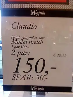 L'euro peut être utilisé à certains endroits au Danemark, le plus souvent dans des endroits fréquentés par les touristes, tels que les musées, les aéroports et les grandes boutiques attirant beaucoup de visiteurs étrangers. Mais la plupart du temps, les prix sont affichés en couronne. À bord des ferrys reliant le Danemark à l'Allemagne, un double affichage des prix, en couronne et en euro, est appliqué.