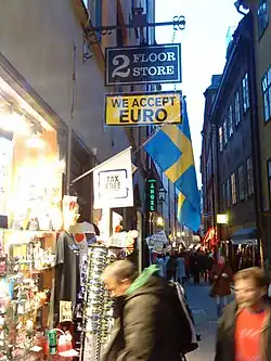Stockholm est la plus importante ville touristique de Suède, si on classe les villes par nombre de nuits passées dans la ville par les touristes. Quelques magasins destinés aux touristes acceptent l'euro, bien qu'il n'y ait aucune politique officielle qui va en ce sens de la part de la municipalité. Les services de taxis peuvent être payés en euro à Stockholm[22]. En 2009, une proposition d'arrêté a été refusée, cet arrêté prévoyait l'introduction officielle de l'euro à Stockholm.