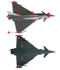 L'Eurofighter Typhoon est un avion de combat multirôle biréacteur, à ailes delta et plans canards, développé par le Royaume-Uni (BAE Systems Military Air & Information), l'Italie (Leonardo) ainsi que l'Allemagne et l'Espagne (Airbus Defense and Space) regroupés dans le consortium Eurofighter GmbH, pays qui ont reçu leurs premiers appareils de série en 2004. L'Autriche, Oman, le Koweït, l'Arabie saoudite et le Qatar s'en sont également portés acquéreurs, portant le total des commandes à 681. Au 31 juillet 2024, 607 Eurofighter avaient été livrés[7]. Depuis la fin de l'année 2023, la Turquie souhaite faire un achat d'une quarantaine d'Eurofighter ; cependant, l'Allemagne se montre réticente, générant des dissensions avec ses partenaires, notamment Airbus[8],[9],[10]