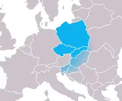 D'origine polonaise, ce concept d’Europe médiane est facilement accepté chez les géographes des pays européens non russes qui ont vécu l'expérience soviétique après 1945, mais qui ont cependant conservé, comme un palimpseste, leur culture européenne antérieure : l'Estonie, la Lettonie, la Lituanie, la Pologne, la République tchèque, la Slovaquie, la Hongrie, la Roumanie, la Moldavie et la Bulgarie. À ces pays, on peut ajouter les pays issus de la fragmentation de la Yougoslavie, et l'Albanie, qui ne faisaient pas partie du bloc soviétique, mais ont connu le même type de régime.