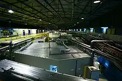 L'anneau technique de circulation des électrons fait 844 mètres de circonférence[20] (soit 269 m de diamètre), mais le bâtiment l'abritant fait environ 760 mètres pour son côté intérieur et environ 1 020 mètres pour son côté extérieur[21]. Un passage surélevé permet de franchir l'anneau afin d'y faire accéder des véhicules dans sa partie centrale.