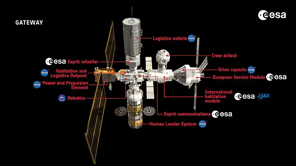 La station spatiale lunaire avec l'ensemble des modules envisagés: PPE, HALO, ESPRIT, iHAB, module sas et bras robotique Canadarm 3. Dans ce schéma trois vaisseaux sont amarrés à la station: le vaisseau Orion qui assure le transfert de l'équipage entre la Terre et la Lune, le vaisseau HLS (représentation très approximative) qui doit déposer l'équipage à la surface de la Lune et un cargo spatial chargé du ravitaillement de la station spatiale.