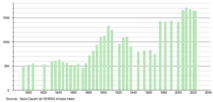 L'évolution du nombre d'habitants est connue à travers les recensements de la population effectués dans la commune depuis 1793. Pour les communes de moins de 10 000 habitants, une enquête de recensement portant sur toute la population est réalisée tous les cinq ans, les populations de référence des années intermédiaires étant quant à elles estimées par interpolation ou extrapolation[25]. Pour la commune, le premier recensement exhaustif entrant dans le cadre du nouveau dispositif a été réalisé en 2005[26].