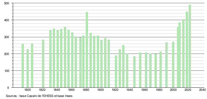 L'évolution du nombre d'habitants est connue à travers les recensements de la population effectués dans la commune depuis 1793. Pour les communes de moins de 10 000 habitants, une enquête de recensement portant sur toute la population est réalisée tous les cinq ans, les populations de référence des années intermédiaires étant quant à elles estimées par interpolation ou extrapolation[17]. Pour la commune, le premier recensement exhaustif entrant dans le cadre du nouveau dispositif a été réalisé en 2008[18].