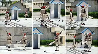 - Evzones en uniforme cérémoniel lors de la relève de la garde près de la tombe du Soldat inconnu à Athènes.