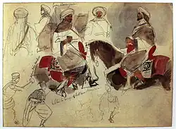 Une aquarelle préparatoire montre un groupe compact de cavaliers chargeant vers la gauche, avec en arrière-plan l'une des portes fortifiées de Meknès[1]. Le tableau à l'huile de 1832 montre un groupe de cavaliers galopant vers la droite, sur fond de paysage de plaine sans élément d'architecture[1].