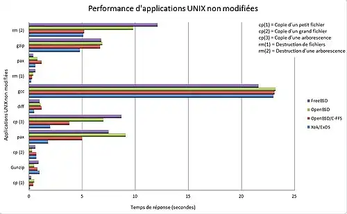 - « Xok » a été utilisé par une autre équipe américaine pour développer des bibliothèques et des applications en environnement multithreading pour des besoins plus évolués[38],[39]. « SMP-Xok » a alors vu le jour dans la même période : exo-noyau dédié à l'architecture x86 32 bits multiprocesseur[20]. De par sa simplicité et sa légèreté de code, l'exo-noyau intéresse le domaine universitaire : « Nemesis »[note 5], noyau d'étude, a vu le jour à l'université de Cambridge[note 6]. Ce noyau a pour avantage d'être implémenté pour de nombreuses plateformes : x86, RISC 64 bits et StrongARM[40].