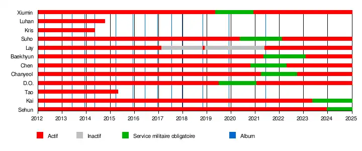 EXO (coréen : 엑소) est un groupe sud-coréo-chinois formé en 2011 et produit par le label SM Entertainment. Le groupe était anciennement composé de 12 membres : six faisaient la promotion des EXO en Corée du Sud : les EXO-K comprenant Suho, Kai, D.O, Sehun, Baekhyun et Chanyeol, et six autres faisaient la promotion en Chine : les EXO-M avec Lay, Tao, Luhan, Chen, Xiumin et Kris. Pour diverses raisons, le groupe ne compte plus que neuf membres à la suite des départs de trois membres du sous-groupe EXO-M (Wu Yifan, Lu Han et Zitao Huang).