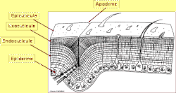 L’exocuticule est la couche intermédiaire de la cuticule. Elle est composée essentiellement de protéines durcies nommées les tannées (en particulier de l’arthropodine (de) et de la sclérotine) qui sont responsables de la rigidité de la cuticule et minoritairement de chitine. La mélanine est également présente donne la coloration brunâtre-noirâtre de nombreux arthropodes.