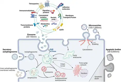 - ↑ (en) María Yáñez‐Mó, Pia R.‐M. Siljander, Zoraida Andreu et Apolonija Bedina Zavec, « Biological properties of extracellular vesicles and their physiological functions », Journal of Extracellular Vesicles, vol. 4, no 1, (ISSN 2001-3078 et 2001-3078, PMID 25979354, PMCID PMC4433489, DOI 10.3402/jev.v4.27066, lire en ligne, consulté le )