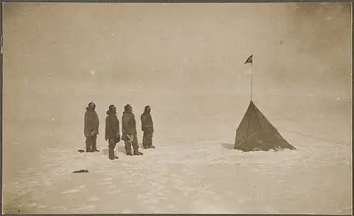 Le 8 décembre, les Norvégiens dépassèrent le record du Farthest South de Shackleton à 88° 23′ S[131]. Alors qu'ils approchaient du pôle Sud, ils cherchaient tout élément du paysage qui pourrait indiquer qu'une autre expédition les avait précédés. Alors qu'ils campaient le 12 décembre, ils furent momentanément alarmés par un objet noir apparaissant à l'horizon mais il s'agissait uniquement de leurs propres chiens s'étant endormis à l'écart qui avaient été agrandis par un mirage[132]. Le lendemain, ils campèrent à 89° 45′ S à 28 kilomètres du pôle[133]. Le 14 décembre 1911, Amundsen et ses camarades se lancèrent dans la dernière ligne droite et ils arrivèrent aux alentours du pôle vers 15 h[134]. Ils plantèrent le drapeau norvégien et nommèrent le plateau polaire, le « plateau du Roi-Haakon-VII »[135]. Amundsen ironisa ensuite sur sa réussite : « Jamais aucun homme n'a réalisé un objectif aussi diamétralement opposé à ses souhaits. La zone autour du pôle Nord, que diable, me fascine depuis mon enfance et je me trouve maintenant au pôle Sud. Peut-on imaginer quelque chose de plus fou ? »[136]