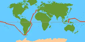 La flotte navigua au sud-ouest vers les Canaries, puis au sud en longeant la côte africaine[3]. En novembre, de Loaísa manœuvra pour traverser l'Atlantique pour rejoindre le Brésil, atteignant les côtes de Patagonie en janvier 1526[3]. Il ne fut pas trouvé de traces de la Trinidad, et de Loaísa décida d'en abandonner la recherche pour continuer vers les Moluques. Cependant, les conditions météorologiques étaient peu favorables les semaines suivantes, avec de forts vents à l'entrée du détroit de Magellan, les navires eurent du mal à rester groupés. Deux navires firent naufrage, le Sancti Spiritus et l'Anunciada firent naufrage, et un autre, le San Gabriel, fut refoulé vers l''Atlantique et déserta l'expédition.