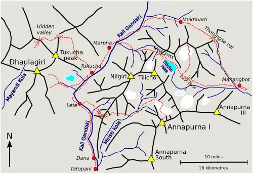 Le 10 avril, l'expédition rejoint Tansen et y fait halte pour trois jours. De nouveaux coolies sont recrutés. Peu après le départ les coolies se mettent en grève réclamant une avance plus importante pour leur travail. L'intervention du représentant du maharajah fait revenir le calme et de nouveau les porteurs reprennent la route. Sedhi Khola est passée. L'équipe longe la Kali Gandaki. Ils rallient Baglung à une altitude de 700 mètres le 16 avril. Là encore d'autres porteurs sont recrutés. Après un arrêt, l'équipe repart en direction de Tukuche à 2 500 mètres d'altitude. Le 20 avril, ils passent Dana, puis Lete ; enfin, le 21 avril toute l'expédition atteint Tukuche après quinze jours de marche et y dresse un nouveau quartier général[3].
