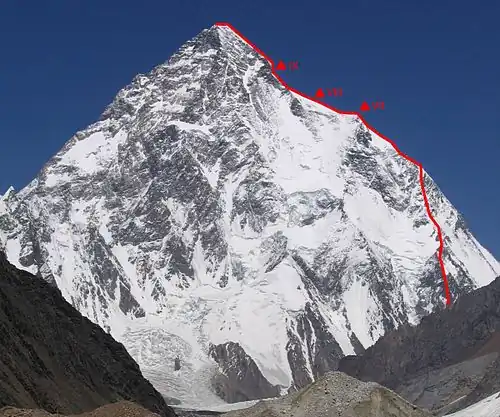 La voie empruntée est surnommée l'« éperon des Abruzzes » et les deux alpinistes qui atteignent le sommet sont Achille Compagnoni et Lino Lacedelli, avec l'aide des autres membres de l'expédition. Walter Bonatti et Amir Mahdi, alors qu'ils transportaient des bonbonnes d'oxygène — essentielles pour le succès de l'ascension — pour ravitailler Compagnoni et Lacedelli, sont contraints de bivouaquer une nuit à plus de 8 100 mètres dans des conditions qui sont bien souvent fatales aux alpinistes.