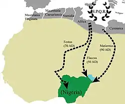 - L'expédition de Festus : Pline écrit[8] qu'en l'an 70 un légat de la Legio III Augusta nommé Festus reproduit l'expédition de Balbus vers le fleuve Niger. Il est allé à l'est du massif du Hoggar et entrent dans le massif de l'Aïr jusqu'à la plaine de Gadoufaoua. Gadoufaoua (mot touareg pour “l'endroit où les chameaux ont peur de se rendre”) est un site dans le désert du Ténéré au Niger connu pour ses nombreux cimetières de fossiles de dinosaures, où les vestiges du Sarcosuchus imperator ont été trouvés. Festus arrive finalement à la zone de l'actuelle Tombouctou. Mais quelques universitaires, comme Fage[9], pensent qu'il n'a atteint que la région de Ghat dans le sud de la Libye, près de la frontière avec le sud de l'Algérie et du Niger (toutefois, il est possible que quelques éclaireurs parmi ses légionnaires aient atteint le fleuve Niger et soient allés dans la forêt équatoriale au niveau de l'estuaire de la rivière, dans l'actuel Nigeria, comme cela s'est produit pour l'exploration du Nil sous Néron lorsque des centurions romains ont atteint le lac Victoria).