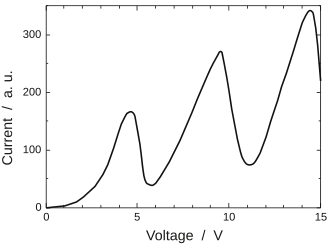 La courbe représentant le courant de l'anode en fonction de la tension aux bornes de la cathode, montre qu'il y a bien des pics d'absorption. L'énergie (et alors la vitesse) des électrons est représentée par le potentiel électrique que subissent les électrons. Cette courbe est de type pseudo-périodique de période 4,9 V et dont l'amplitude augmente en fonction de la tension d'extraction.