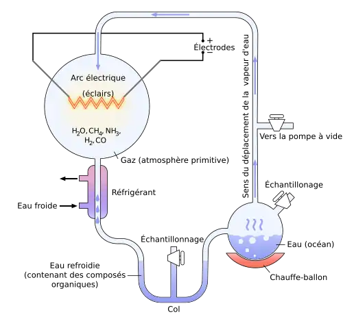 En 1953, Stanley Miller, accompagné de Harold Urey, a voulu reproduire les conditions de la Terre primitive. Ils ont enfermé dans un ballon des gaz (méthane CH4, ammoniac NH3, hydrogène H2, carbone CO et eau H2O) et soumis le mélange à des décharges électriques pendant sept jours.