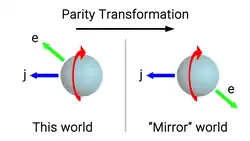 En d’autres termes, dans le monde « réel », si la rotation nucléaire du cobalt-60 et les émissions de produits de désintégration allaient toutes deux à peu près dans la même direction, alors dans le monde « miroir », elles seraient à peu près dans des directions opposées, car l’émission la direction aurait été inversée, mais pas la direction de rotation[10]. Il s’agirait d’une nette différence dans le comportement de l’interaction faible entre les deux « mondes », et on ne pourrait donc pas dire que l’interaction faible soit symétrique en parité. La seule manière pour que l'interaction faible puisse être symétrique en parité est s'il n'y avait pas de préférence dans la direction d'émission, car alors un changement de direction dans la direction des émissions dans le monde « miroir » ne serait pas différent du monde « réel » car il y a il y avait de toute façon un nombre égal d’émissions dans les deux sens.
