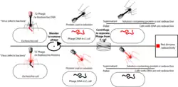 Dans leur première série d'expériences, Hershey et Chase ont tout d'abord marqué l'ADN des phages par du phosphore 32, noté 32P, un isotope radioactif du phosphore : en effet, le phosphore est présent dans l'ADN mais dans aucun des acides aminés composant les protéines qui sont ensuite synthétisées. Ils ont ensuite infecté une souche d’Escherichia coli, une entérobactérie, et ont pu observer le transfert de l'ADN du phage marqué au 32P dans le cytoplasme de la bactérie.