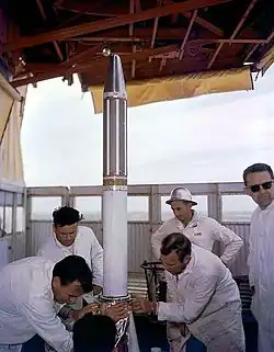 Le 20 décembre 1957, le premier étage du lanceur Jupiter-C arrive à la base de lancement de Cap Canaveral en Floride. Au cours du mois suivant, le satellite puis les étages supérieurs sont assemblés sur le pas de tir 26A et une première répétition du lancement est effectuée le 27 janvier 1958. Après avoir différé durant plusieurs jours le décollage à cause de conditions météorologiques défavorables, le lanceur Juno I décolle le , à 03 h 48 GMT et place sur orbite le satellite Explorer 1, qui devient ainsi le premier satellite artificiel américain. Son orbite a un périgée de 358 kilomètres, un apogée de 2 550 kilomètres, avec une période de 114,8 minutes[16],[17],[18]. La masse totale du satellite est de 13,97 kilogrammes, dont 8,3 kg d'instrumentation, batteries comprises.