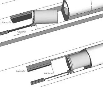 La culasse entraîne l'extracteur dans son recul, provoquant soit le recul de la douille (dans ce cas un éjecteur expulse la douille hors de l'arme) soit le mouvement éjecte directement la douille.