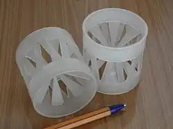 Les différents types de garnissage sont constitués de divers matériaux et peuvent adopter plusieurs formes, ce qui détermine leur surface, leurs propriétés d'écoulement et leur effet sur la perte de charge. Parmi les garnissages céramiques d'ancienne génération figurent les anneaux de Raschig et les selles de Berl. Ils sont aujourd'hui détrônés par les anneaux Pall et les anneaux Białecki, en métal et en plastique[5], ainsi que les selles Intalox en céramique. Chacun de ces garnissages permet une plus grande surface de contact avec le fluide, un meilleur écoulement du fluide à travers la structure ou une perte de charge moins élevée. Il importe également que les éléments de garnissage ne puissent pas s'empiler les uns sur les autres, phénomène qui réduit considérablement la surface qu'il offre au fluide. Le développement de nouveaux garnissages à base de treillis vise à améliorer ces caractéristiques[4].
