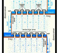 Les colonnes à plateaux sont constituées d'une tour verticale où le liquide s'écoule du haut vers le bas. La phase gazeuse entre par le bas de la colonne et sort par le haut. À l'intérieur de la colonne se trouvent des plateaux, qui forcent le liquide à s'écouler horizontalement tandis que la vapeur barbote à travers les trous des plateaux. Le but de ces plateaux est d'augmenter l'aire de contact entre les phases liquide et gazeuse.