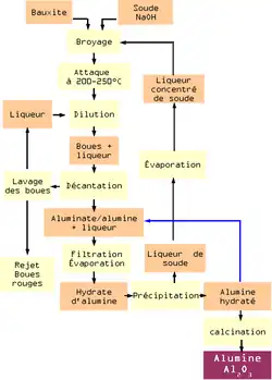 Il a été mis au point par Karl Josef Bayer en 1887 afin d'extraire l'alumine provenant de la bauxite. Le procédé est basé sur (i) la dissolution à chaud de l'alumine contenue dans la bauxite à l'aide de soude, (ii) l'élimination des impuretés par décantation, (iii) la re-précipitation d'un hydrate d'alumine purifié lors du refroidissement, (iv) l'obtention de l'alumine après calcination[3].