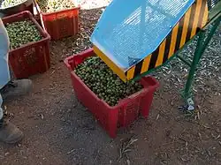Dans le cas de lots de faible importance, récoltés intégralement à la main, cette phase se déroule en partie dans l'exploitation oléicole dans le but d'atteindre les quantités nécessaires pour un cycle de traitement. Pour des lots plus importants, obtenus en général par des moyens mécanisés, les olives récoltées sont directement livrées au moulin à huile et entreposées dans un espace ou un local séparé (l'olivaio), voire directement dans un espace situé au départ de la ligne de traitement. Autrefois, on entreposait les olives en sacs de jute, actuellement on emploie des caisses ajourées ou des palox[1] dans le cas de systèmes palettisés, en réduisant autant que possible l'épaisseur des couches pour améliorer l'aération des olives et prévenir les risques de fermentation.