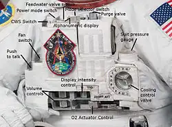 - le boitier de contrôle DCM (Display and Controls Module) permet à l'astronaute de contrôler le fonctionnement de sa combinaison spatiale et d'accéder à différents réglages (volume et réglage radio, contrôle de la pression d'oxygène, réglage de la température, purge du circuit de ventilation, réglage intensité des projecteurs,...)[12].
