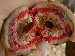 Fruit coupé en deux montrant la graine fraîche.