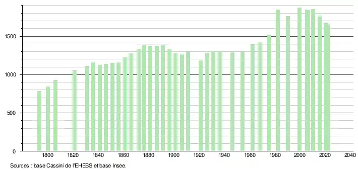 L'évolution du nombre d'habitants est connue à travers les recensements de la population effectués dans la commune depuis 1793. Pour les communes de moins de 10 000 habitants, une enquête de recensement portant sur toute la population est réalisée tous les cinq ans, les populations de référence des années intermédiaires étant quant à elles estimées par interpolation ou extrapolation[24]. Pour la commune, le premier recensement exhaustif entrant dans le cadre du nouveau dispositif a été réalisé en 2005[25].