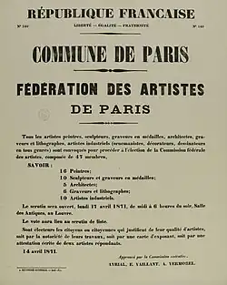 Le , soit moins de trois semaines après le début de l'insurrection, Courbet, désormais élu du conseil communal et membre de la commission de l'Enseignement, lance un appel aux artistes. Ils doivent, selon lui, « concourir à la reconstitution de l'état moral de Paris et au rétablissement des arts qui sont sa fortune »[2].