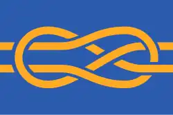 « Sur un fond bleu, s’étendant horizontalement, deux cordes jaunes forment des nœuds entrelacés ». Le nœud formé est un nœud d'écoute.