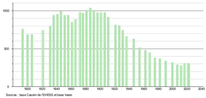 L'évolution du nombre d'habitants est connue à travers les recensements de la population effectués dans la commune depuis 1793. Pour les communes de moins de 10 000 habitants, une enquête de recensement portant sur toute la population est réalisée tous les cinq ans, les populations de référence des années intermédiaires étant quant à elles estimées par interpolation ou extrapolation[19]. Pour la commune, le premier recensement exhaustif entrant dans le cadre du nouveau dispositif a été réalisé en 2006[20].
