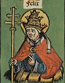 Félix de Anici, qui n'avait pas de chiffre de son vivant, aurait dû porter le nom pontifical Félix II, puisque Félix II, un arien, est en réalité un antipape contre le pape légitime Libère ; cependant, étant donné que l'antipape Félix II a été confondu avec un martyr du même nom, vénéré par l'Église catholique comme un saint, il a été considéré pendant de nombreux siècles comme légitime et, par conséquent, inclus dans le décompte[1].