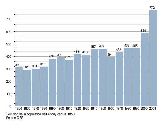 Le graphique suivant résume l'évolution de la population de Fétigny entre 1850 et 2008[5] :