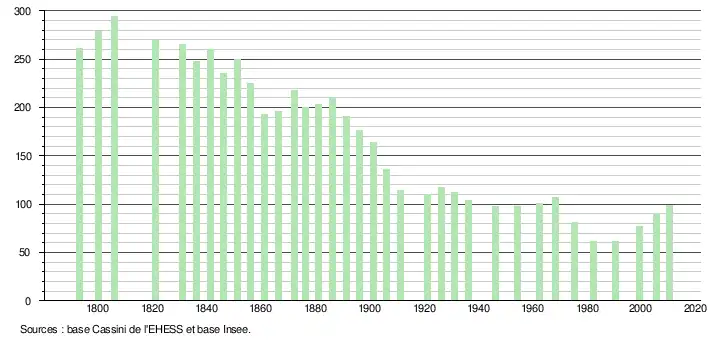 - ↑ Par convention dans Wikipédia, le principe a été retenu de n’afficher dans le tableau des recensements et le graphique, pour les populations légales postérieures à 1999, que les populations correspondant à une enquête exhaustive de recensement pour les communes de moins de 10 000 habitants, et que les populations des années 2006, 2011, 2016, etc. pour les communes de plus de 10 000 habitants, ainsi que la dernière population légale publiée par l’Insee pour l'ensemble des communes.