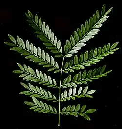 Les feuilles pennées sont longues de 10 à 15 cm, alors que les feuilles bipennées, sont longues de 20 à 30 cm, avec 2-6(-8) paires de pennes, avec chacun, une vingtaine de folioles de 1 à 2 cm.