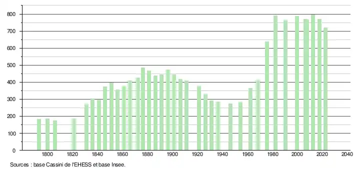 L'évolution du nombre d'habitants est connue à travers les recensements de la population effectués dans la commune depuis 1793. Pour les communes de moins de 10 000 habitants, une enquête de recensement portant sur toute la population est réalisée tous les cinq ans, les populations de référence des années intermédiaires étant quant à elles estimées par interpolation ou extrapolation[15]. Pour la commune, le premier recensement exhaustif entrant dans le cadre du nouveau dispositif a été réalisé en 2007[16].