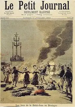 « La côte de Plougastel offrait hier soir, à la nuit tombée, un bien curieux aspect. Çà et là de longues gerbes de flammes montaient vers le ciel. C'étaient les feux que, par suite d'une antique coutume, on allume chaque année en Bretagne, en l'honneur de la Saint Jean.