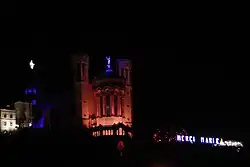 La colline de Fourvière et la primatiale Saint-Jean durant la fête des Lumières.