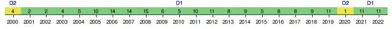 | 2000 | 2e | 4e | 19 | 11 | 6 | 1 | 4 | 19 | 10 | +9 | — |