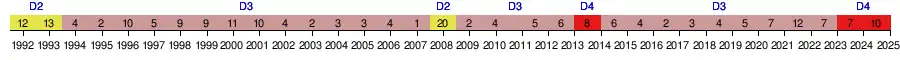 | 1982 | 12e | 25 | 28 | 9 | 7 | 12 | 29 | 32 | -3 | — | |