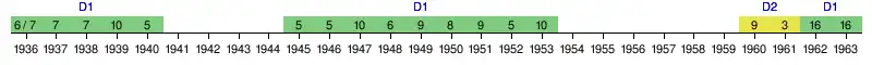 | 1939 | 10e | 22 | 26 | 8 | 6 | 12 | 41 | 56 | -15 | Seizièmes de finale | |