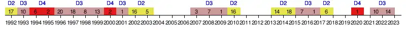 | 1988 | 13e | 29 | 34 | 7 | 15 | 12 | 41 | 42 | -1 | ||