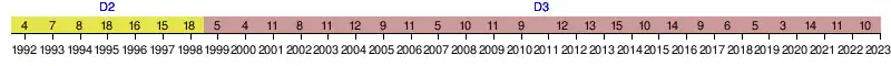 | 1982 | 10e | 31 | 32 | 12 | 7 | 13 | 34 | 35 | -1 | ||