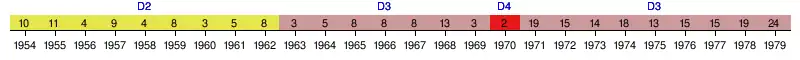 | 1971 | 3e Zone 4 | 19e | 30 | 38 | 9 | 12 | 17 | 27 | 48 | -21 | |