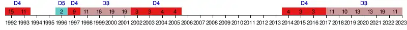 | 2015 | 3e | 26 | 14 | 8 | 2 | 4 | 23 | 10 | +13 | ||