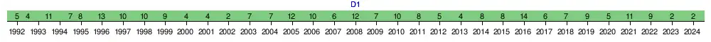 | 1996 | 13e | 38 | 30 | 7 | 8 | 15 | 25 | 48 | -23 | ||